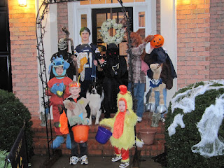 Our kids: Josiah - the duck (he got a little upset when people called him a chicken, lol!), Isaiah - the Indian (this was a school Thanksgiving concert costume, not even a Halloween costume! But he just didn't want to put anything else on...), Jeremiah - Stitch, Elijah - The Headless Horsemen. My nephews are Ben (football ball, can't remember team) and Nick (the 'Unknown Ghoul' with the red eyes).